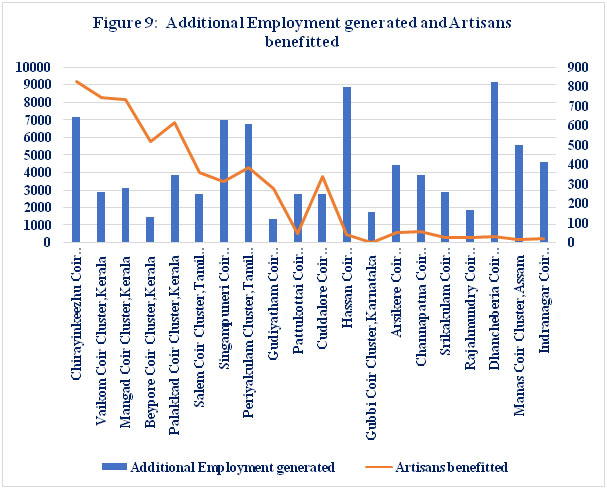 As per figure 9 Additional Employment Generated is from 125 to 825 and No. of artisans benefitted is from 46 to 8300 for 20 coir clusters in India.
